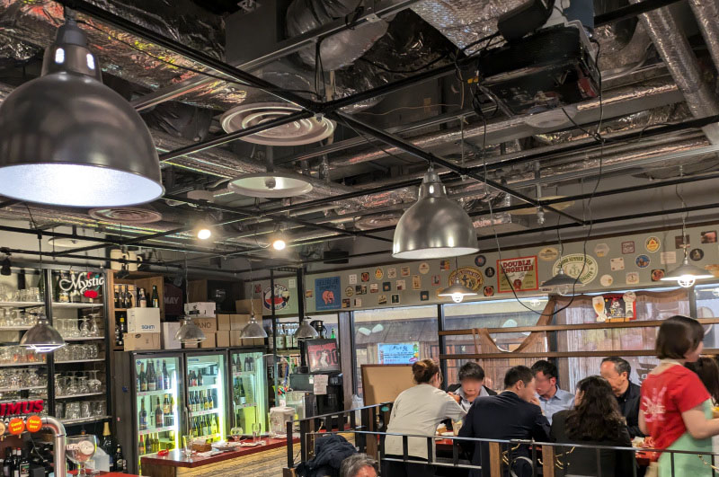 The bar is a popular destination for after-work get-togethers, and seating on multi-level platforms makes the compact dining room seem a bit more spacious. The kitchen turns out decent beer snacks (frites, nachos with chile con carne), as well as roast meats (chicken, duck) and ten kinds of pasta.