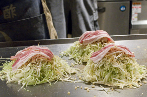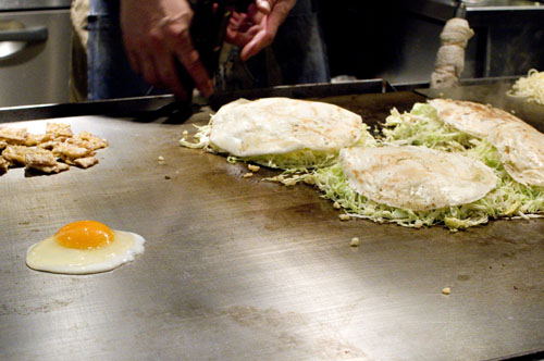 The menu offers four or five different okonomiyaki variations, such as the "special" that includes fresh shrimp and cuttlefish in addition to the basic pork-cabbage recipe. You can also choose from three different types of noodles, including "spicy noodles" with a pleasantly refreshing dose of cayenne pepper.