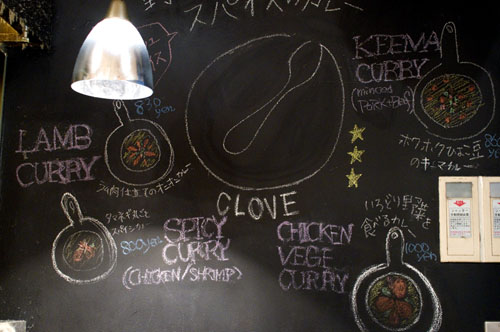 The multi-vegetable curry comes with a colorful assortment of seasonal vegetables, sauteed briefly but still generally firm in texture. The roux is sweeter than average, and livened up with bits of chicken. Each of the curries has a nice balance of spices, including clove (as you might guess from the shop's name). Basic curries are Y800-000, with most extra toppings priced at Y100 each, and everything is available for take-out.