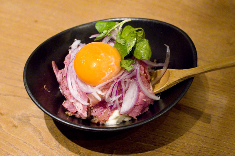 The raw chicken is an heirloom-breed bird from Miyazaki Prefecture - tender breast meat served with a hefty dose of wasabi. Nikuzushi's special potato salad, incorporating onions, greens and a raw egg, provides a nice break from all the meat.