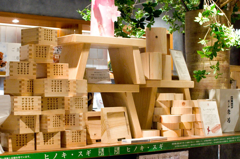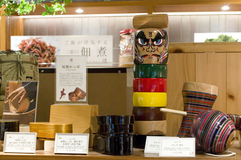 The drinks refrigerator stocks around twenty different sake, including small one-cup sizes, and more than a dozen beers by the bottle from the Ise Kadoya brewery (Y450-864 per bottle). The handicrafts section features wooden sake cups and other crafts made from cypress and cedar wood, as well as pottery and stoneware.
