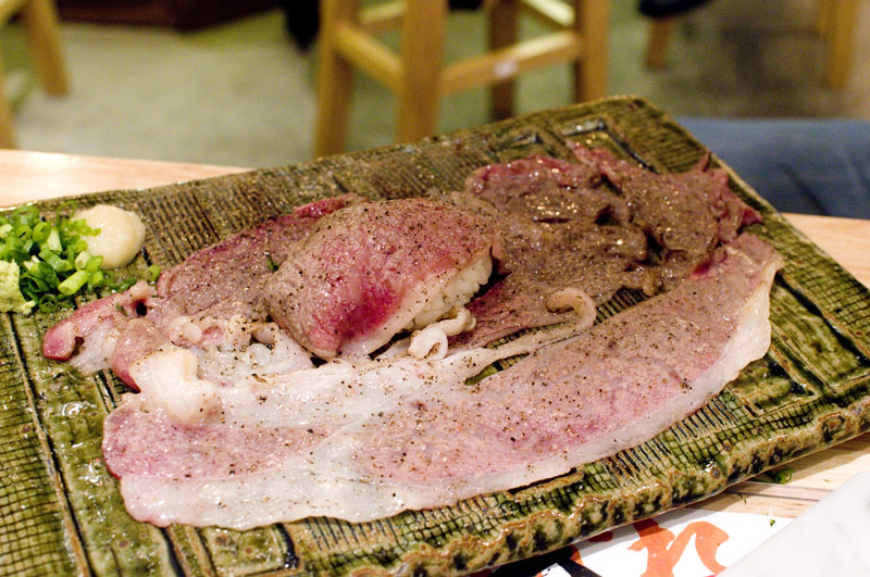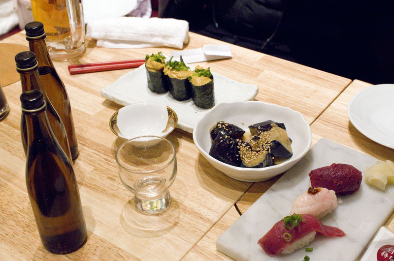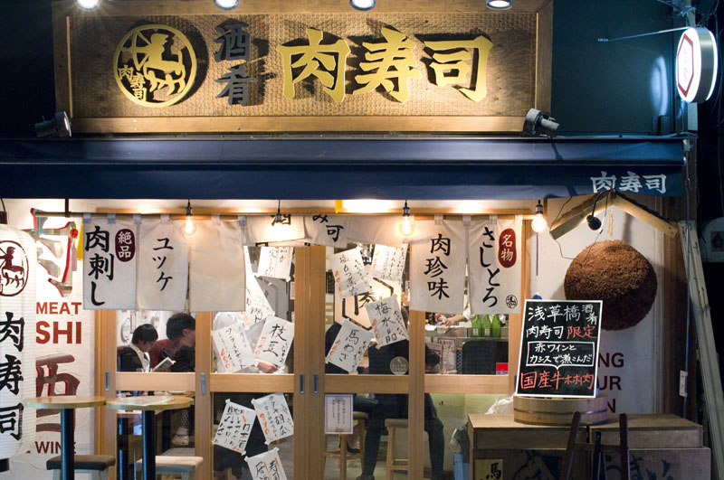 One of several "meat bars" located in this stretch of Asakusabashi, Nikuzushi offers a wide variety of meat-topped sushi and a decent selection of sake to go with it. Sushi by the piece comes with toppings like Iberico pork, foie gras, teriyaki chicken, beef tongue, and wagyu sukiyaki - all cooked - but there are also assortments of raw chicken and horsemeat if you're feeling adventurous.