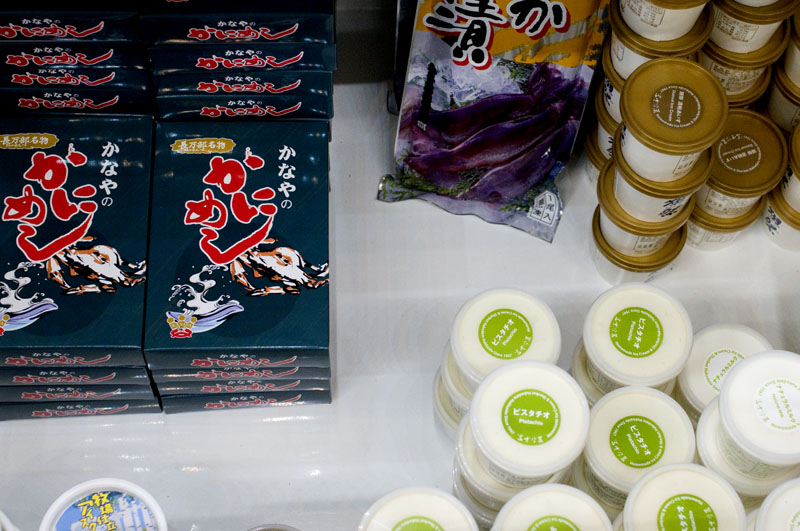 Over in the freezer compartment you'll find more than twenty varieties of local ice creams in exotic flavors like marscapone, hojicha, espresso and sake. There are racks filled with tourist pamphlets at the back of the aisle, in case you feel compelled to visit Hakodate after tasting its local snacks.