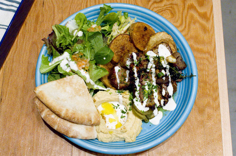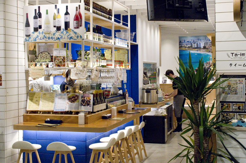The menu expands a bit at dinnertime, with additional options like lamb and beef kebabs, shakshuka (egg and vegetable casserole), matbucha (a spicy tomato and pepper cooked salad), basmati rice dishes and traditional Middle Eastern sweets. The brightly decorated shop has a handful of tables at the back and counter seating as well. Lunches are priced from Y1080-1680, while dinner averages around Y3000-3500 for food and drink.