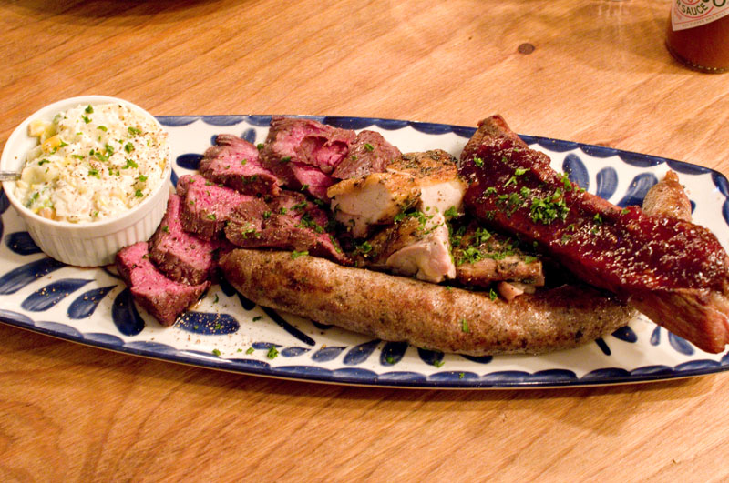 Some menu highlights include a pleasantly peppery Baked Mac and Cheese, tangy Wasabi Cole Slaw, and garlicky shrimp ajillo, served here on skewers rather than in a bowl of hot oil. The Beef Bavette Steak and home-made Salsiccia were the winners of the Four-meat Combo Platter, and next time around we'll be ordering them a la carte. Ask for Dijon mustard on the side to go with the sausage.