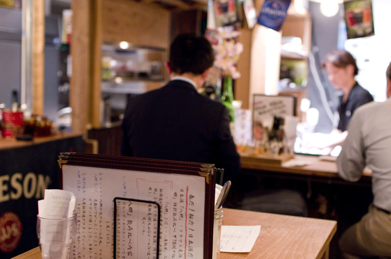 The bar's dining area is bigger than it looks from the outside, with 110 seats as well as a small standing zone up front. The main dining room is furnished with lots of high tables and a couple of small counters, and there are a few cozy-looking smaller dining spaces in the back. Budget around Y2500-4000 if you're having dinner with drinks, or less if you're just stopping in for a couple of beers and a snack.