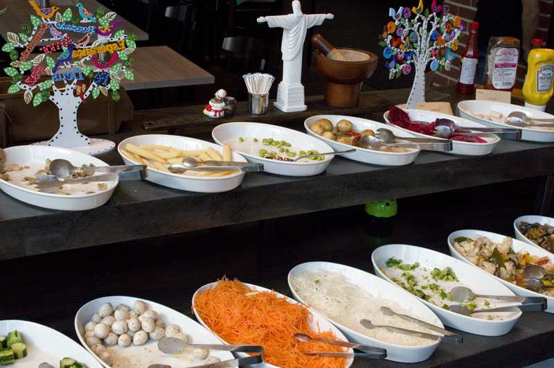 Among Brazilian churrasco restaurants in Tokyo, Que Bom's lunchtime Brazilian buffet is an especially good deal. A churrasco plate with three kinds of meat plus the buffet is just Y1280, and you can add on extra servings of meat for Y100 a piece. The buffet table is nicely laid out with salad-bar greens and vegetables (such as hearts of palm), a nicely prepared feijoada black-bean stew, chicken stroganoff, garlicky fried chicken and several other non-salad items.