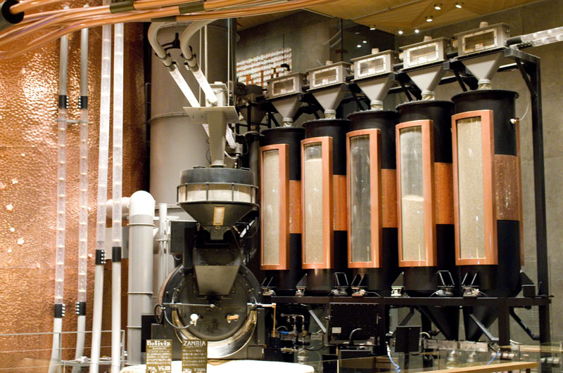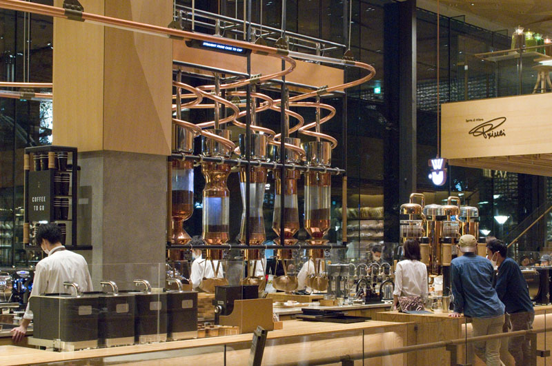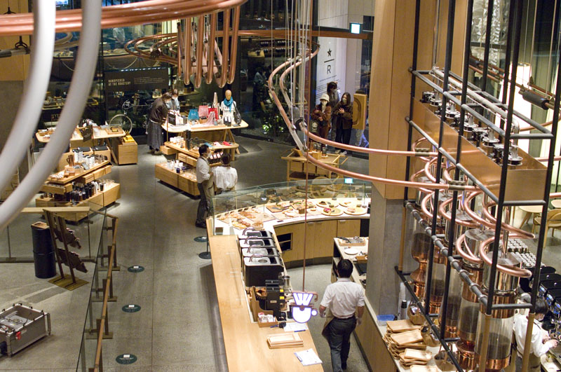 A huge 3,000-square-meter retail space designed by noted architect Kengo Kuma, this is the largest Starbucks branch in the world, and the fifth in their series of Reserve Roasteries. The centerpiece of the interior is a 17-meter-tall copper cask that rises up through the four levels of the shop and is connected to silos at the individual coffee counters by a series of overhead tubes.