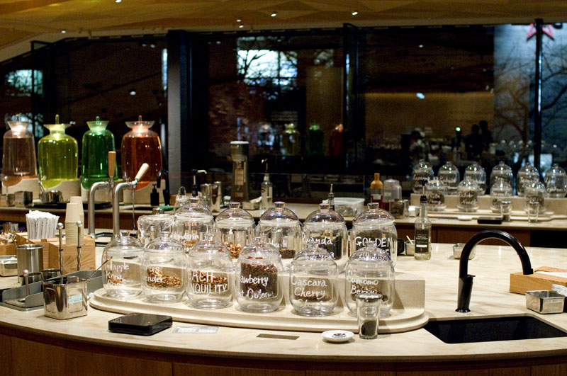 Up on the second floor there's a tea bar, serving 18 loose-leaf teas and various tea-based drinks. The third-floor Arriviamo bar features original coffee- and tea-based cocktails drinks such as the Kaga Salt Caramel Milk Tea (brandy, Hojicha tea, butterscotch espuma foam) as well as wine and beer.