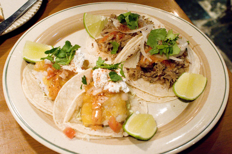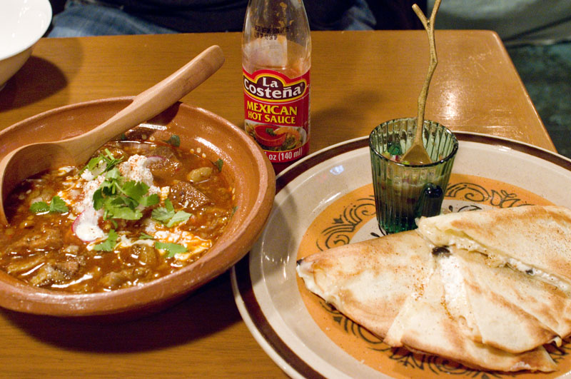 We started a recent meal with an excellent menudo (tripe stew) and some very cheesy quesadillas served with a nice home-made green salsa. Both fish and pork-filled tacos were ample in size and quite satisfying. Other tempting main dishes include Costillas Ahumadas (smoked ribs), and Chicken Mole made with heirloom-breed Daisendori chickens.