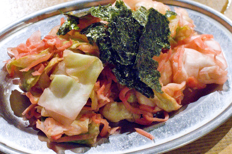 All the chicken we've tried here has been tender and very flavorful, with excellent skewers of bonjiri (tail), harami (diaphragm) and soriresu (juicy "chicken oyster" next to the thigh joint). Vinegared cabbage is a standard accompaniment to Kyushu yakitori, and the especially tasty version here comes with strips of nori and bits of ginger. Sauteed zucchini provides a refreshing break from the grill - unlike in most yakitoriya, grilling on skewers isn't the only option for vegetables here.