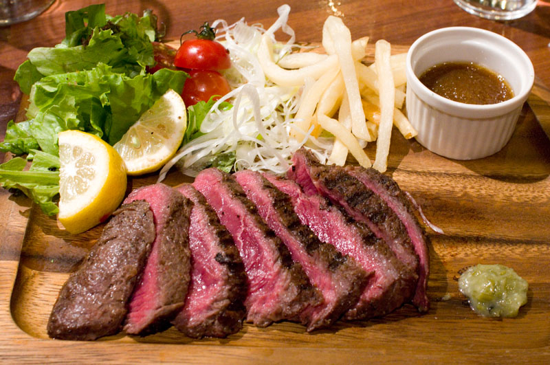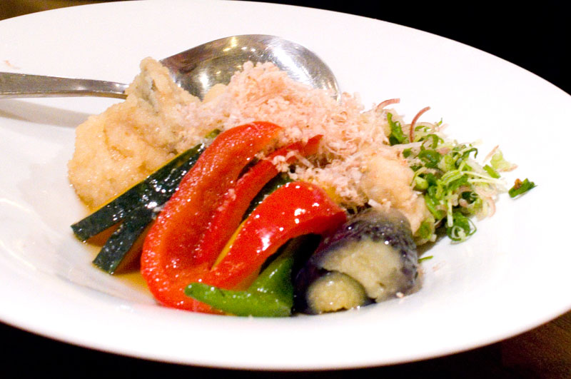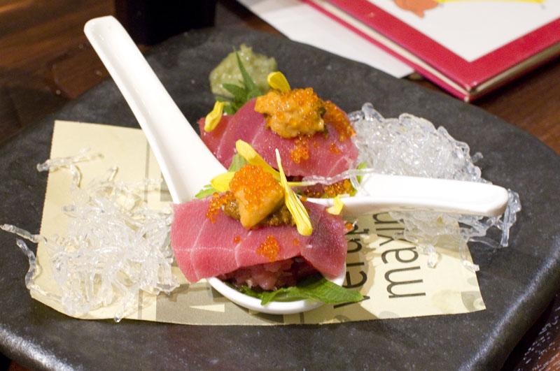 The food menu is built around grilled meats and small sake-drinking delicacies, with several dishes that feature A3-grade wagyu beef. Some highlights during recent visits were a deeply flavored beef-tendon nikomi, a garlicky vegetable ajillo (served in a bowl rather than swimming in oil), and very tender A3 wagyu rump steak. Potato salad topped with corned beef hash is an unusual take on this ubiquitous izakaya dish, and tiny bites of tuna topped with uni were an appetizing combination.
