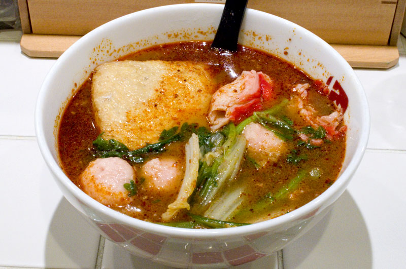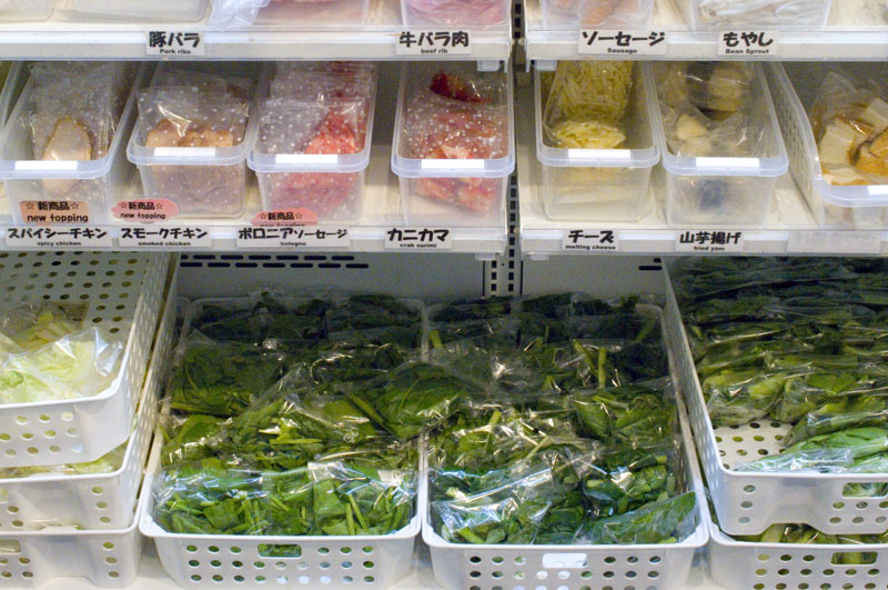 Some popular ingredient choices include dumplings stuffed with shrimp and crabmeat, leafy vegetables like spinach, bok choy and shungiku, and enticing combinations like bacon-wrapped cheese and fried tofu stuffed with ground pork. These add-on toppings come in pre-measured packets, and they're lined up in a big refrigerated cabinet at the shop's entrance.