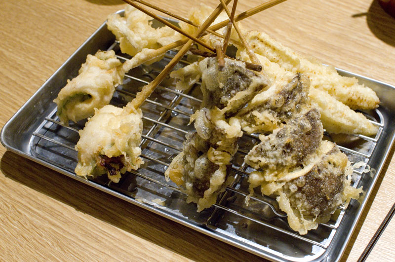 While this is ostensibly a soba shop, most evening visitors are here for the deep-fried kushiage skewers, served with sake, shochu or beer. Skewers come in a nice range of both seafood and vegetable ingredients, and with prices starting at just Y120 they can be hard to resist.
