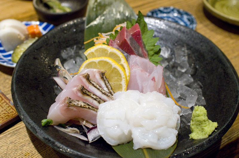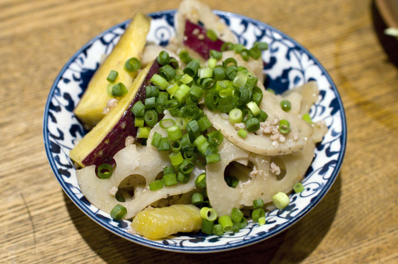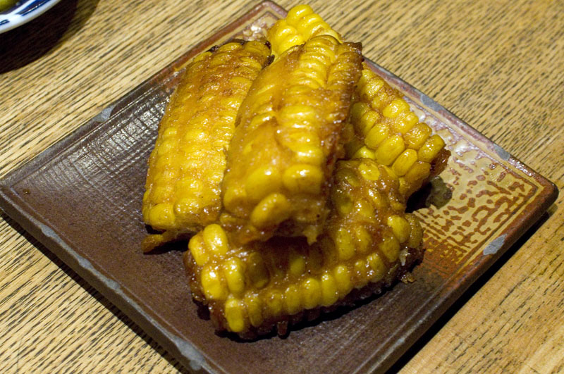 Warayaki, or straw-roasted cooking, is a technique for quickly searing ingredients like chicken and bonito at very high temperatures. It's entertaining to watch, and the straw imparts a pleasant, slightly woody aroma to the food. The warayaki chicken here is beautifully prepared, complemented by garlicky seasoning and served over a bed of vinegared raw cabbage with a hefty helping of cilantro.