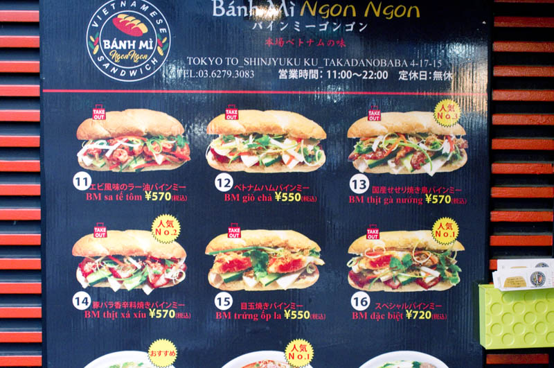 One of several banh mi shops in this part of Takadanobaba, Ngon Ngon also serves pho, and they're furnished with fifteen seats if you want to eat here rather than take out. There are six sandwich variations to choose from, and the ones we've tried have a nice variety of ingredients, good meaty flavors and crisp vegetables. Full-size sandwiches start at Y550.