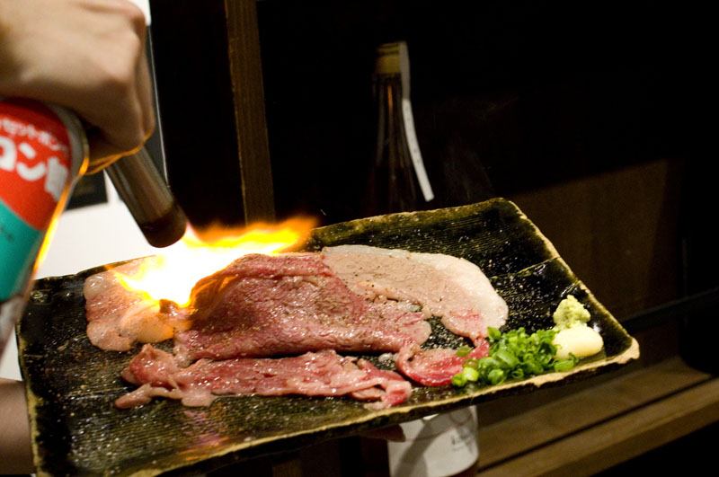 Nikuzushi's signature torisashi platter is particularly recommended - very thinly sliced, fatty cuts of beef short ribs, seared with a blowtorch at your table and seasoned with salt and pepper. There's a compact sake list that's been assembled to go well with meat. Budget around Y3,500 for food and drink at dinnertime.