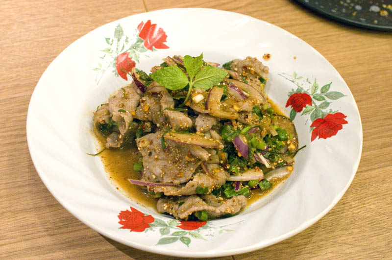 While there are a few items that will be very familiar to Tokyo Thai restaurant-goers, (Tom Yum soup, Massaman curry), the focus is mostly on original versions of Isan dishes like Tom Saap Kra Dook Aon (spicy Isan pork-cartilage soup), Nam Tok Moo (spicy grilled-pork salad with roast minced rice), Pad Pak Boong (stir-fried morning glory) and a couple of different kinds of Isan sausage. Ingredients are fresh-tasting and spicy salads pack a punch.