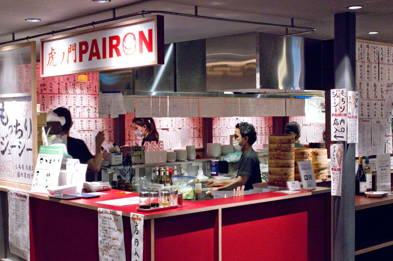 The setting is quite informal - just a double row of small tables behind the kitchen, and a standing counter in front of the shop if you just want to pop in for a quick snack. Pairon can serve as a filling final stop on a bar-hopping tour of the Toranomon Yokocho bar complex, or a destination of its own for a very casual meal. Budget around Y2,500 for food and drink.