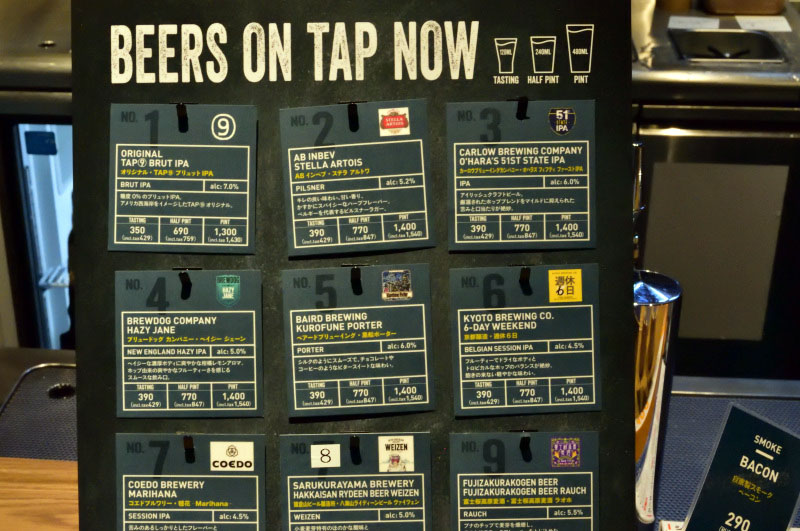 Eight taps dispense craft beers in various styles, including one original (Tap9 Brut IPA). A recent taplist included brews from Carlow Brewing (Ireland), Kyoto Brewing, Fujizakura Kogen (Yamanashi) and Coedo (Saitama). Beers come in three sizes, and are mostly priced at Y770 and Y1,400 for half-pints and pints. Three-part tasting flights are Y1,210, or you can assemble a four- or five-part flight since all the beers are available in 120ml taster sizes.