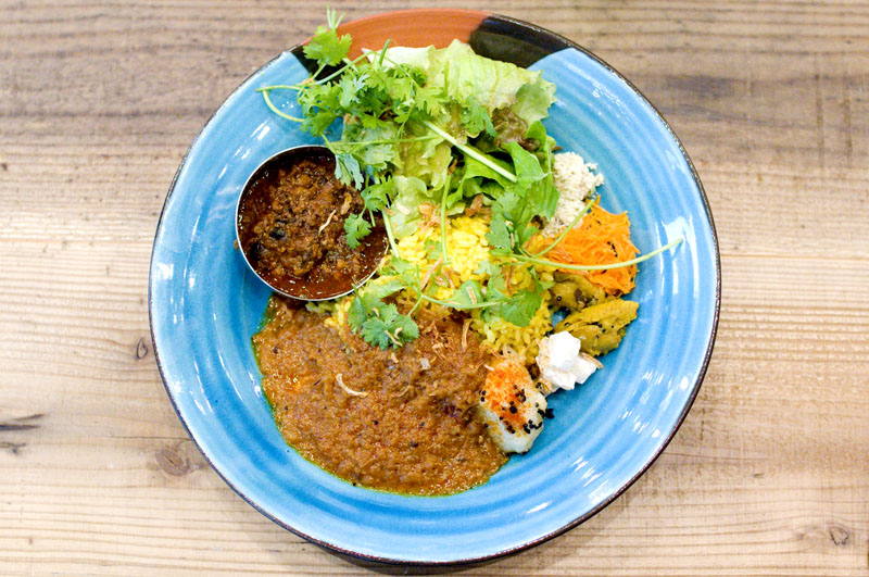 Like many cafe-style curry shops they serve original (as opposed to more orthodox Indo- or European-style) curries. The original Ebisu branch soared in popularity after it was featured in an influential magazine-book called "Ultimate Curry." Their busy-looking curry plates are artfully assembled on colorful pottery, with tiny portions of side ingredients (mushrooms, boiled potato, bits of sliced apple) rather than just curry and rice.