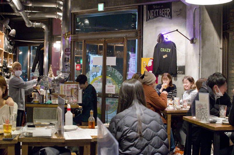 Taking over the space formerly occupied by the Awajicho branch of Craft Beer Market, this budget-friendly bar offers over a dozen craft beers on tap along with kiln-baked pizza and small snacks, starting at Y300 per dish. Beers from breweries like Stone (California) and Black Tide (Miyagi) are priced at Y550 for a half pint (250ml) and Y900 for a pint (473ml), and there are always a few specials starting from Y389 for a half pint. The cover charge is Y300.