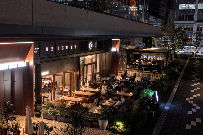 Beignet's main dining room is attractively furnished and quite lively, although perhaps louder than average. It's quieter outside though - like the rest of the flashy Tokyo Torch Terrace complex, there's ample terrace seating for when the weather permits. Budget around Y4,000-6,000 for dinner with drinks. Lunches start at Y1,180.