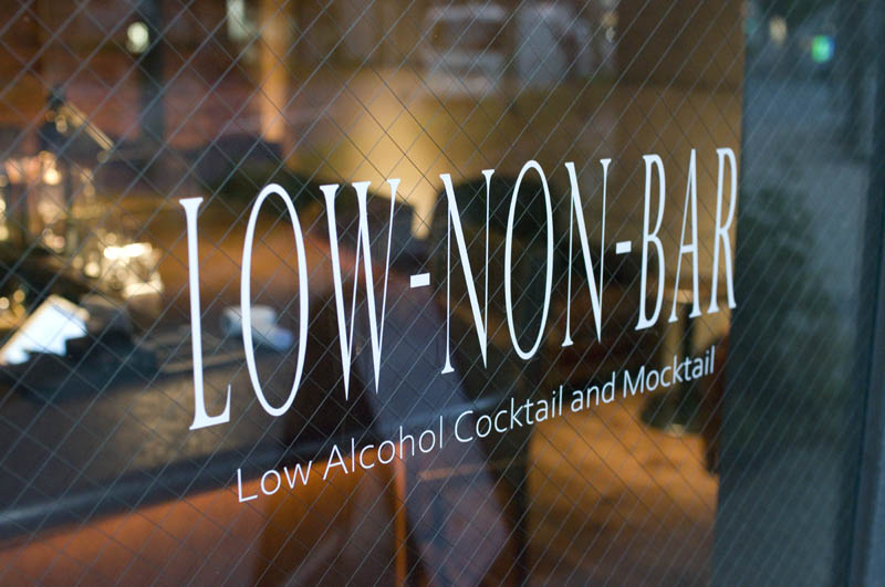 You can choose from non-alcoholic versions of classic cocktails (Bloody Marys, Mojitos, Moscow Mules) or elaborate original cocktails like the Blanc (non-alcoholic wine, Chinese tea, shiso and cucumber) or the namesake Non-Low-Bar (a "shrub" cocktail of drinking vinegars flavored with various berries, spices and herbs). For adventurous drinkers we can recommend the Wabi-Sabi - a nicely balanced concoction of non-alcoholic sake, chocolate and a fair bit of wasabi, served with a huge rectangular chunk of ice that's coated in silver leaf.