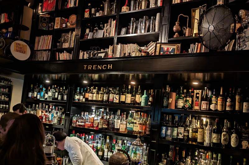 Trench offers an intriguing menu of signature cocktails and "twisted classics," and they also stock a huge assortment of liquor and liqueurs if you want to branch out on your own. The interior space is tiny, with seats for only thirteen customers, but the two-story ceilings, street-facing windows, and impressive set of bookshelves above the bar give it the feel of a comfortable urban lair.