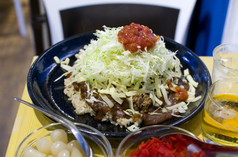 Other curry choices are chicken curry, a very meaty taco curry (based on Okinawan taco rice), katsu curry, curry spaghetti and a vegetable salad plate with a small curry on the side. Optional toppings include cheese, avocado and pork cutlet. Curries and other main dishes are priced from Y800-1,200, with toppings adding a bit extra.