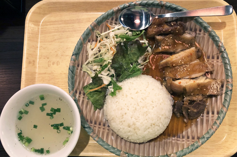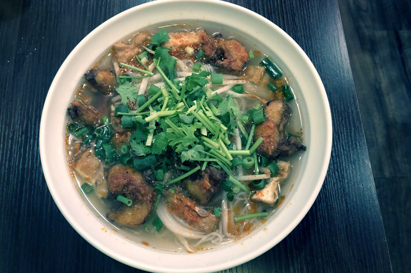 They also do a great variation on the southeast Asian staple of chicken rice. Instead of steamed chicken, "Com ga me" pairs white rice with crispy fried chicken slathered in a sweet tamarind sauce. Another unusual favorite is "Bun ca," a large bowl of Bifun soup noodles topped with chunks of fried white fish, fried tofu, beansprouts and green onions.