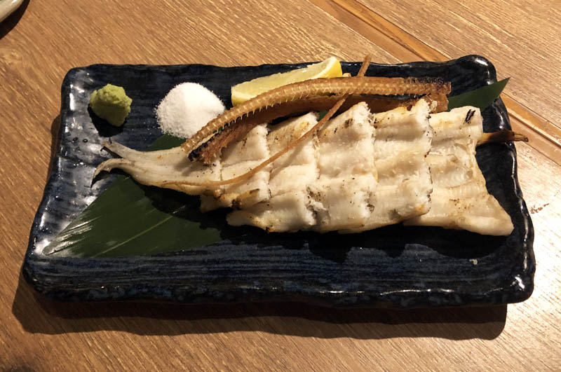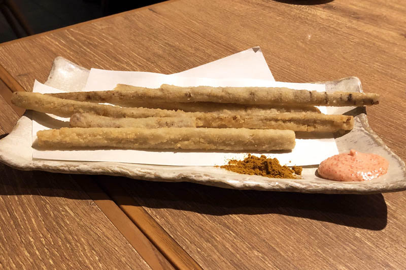 The deep-fried burdock roots are crunchy and sweet, accompanied with curry powder and mentaiko-mayo dip. The grilled anago (saltwater eel) is served with the backbone deep-fried too, a delightful crispy snack. The sashimi platter is really well presented and featured sweet shrimp, tender squid, fatty salmon and sea bream. Another surprise was the tuna sushi roll: fatty tuna rolled with mountain yam and wrapped in yuba (tofu skin). The dip was soy sauce and raw egg yolk, a rich and unusual choice.