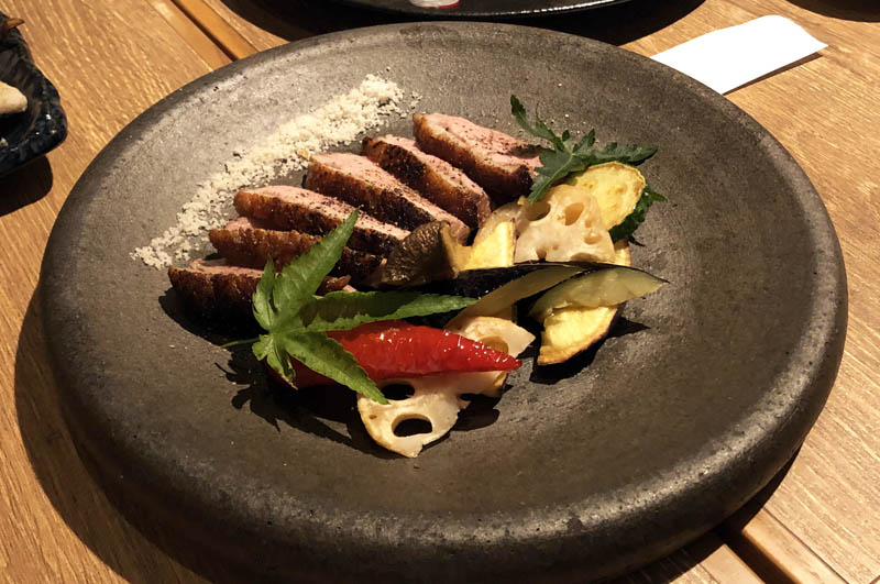 The buckwheat soba here is made daily from freshly ground soba flour. It's served with karasumi (mullet roe), wasabi and shiso sprouts, and it's delicious. The noodles go well with the traditional pairing of duck, which here is rich and fatty, and served with seasonal-vegetable tempura and truffle salt.