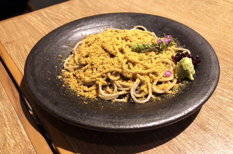 While billed as a soba restaurant, there is a great choice of seasonal dishes and recommendations before the mains. On a recent visit, we had a great time trying the side dishes. Our host recommended the shungiku salad with sesame oil and it was quite a performance. A large bowl of chrysanthemum greens is brought over inside an even larger plastic bowl before being liberally drenched with fragrant steaming sesame oil. It sizzles and spits, hence the protective bowl. Surprisingly, it wasn't an overpowering or oily dressing when mixed with the pungent greens.