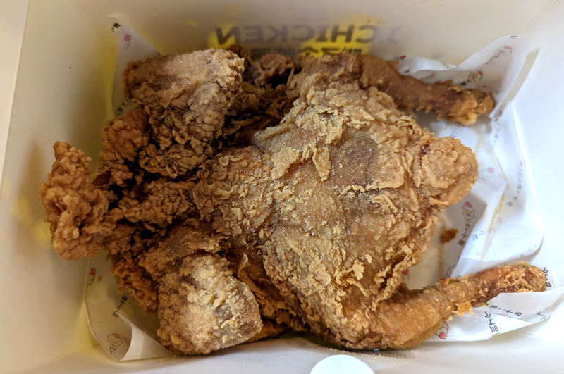 There's also a blackened version of the fried chicken that's colored with squid ink, in case you're throwing a themed party of some kind. If you don't want a whole bird, chicken is available by the half-bird, by the piece, or in the form of chicken burgers. Side dishes include "super cheese balls", which have a chewy mochi-like texture, and miniature spicy red sausages. Drinks include various flavors of tapioca milk tea and other soft drinks.