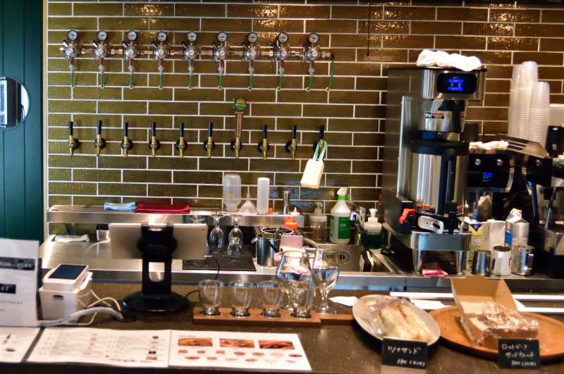 A recent tap selection featured beers from Y Market (Nagoya), Sierra Nevada and Stone, starting at Y980 for a half pint. Four-part (preselected) tasting flights are Y2,000. Canned/bottled beers seem to be priced a bit higher than average for Tokyo, especially if you're getting them to go, as the prices are the same as for drinking here.