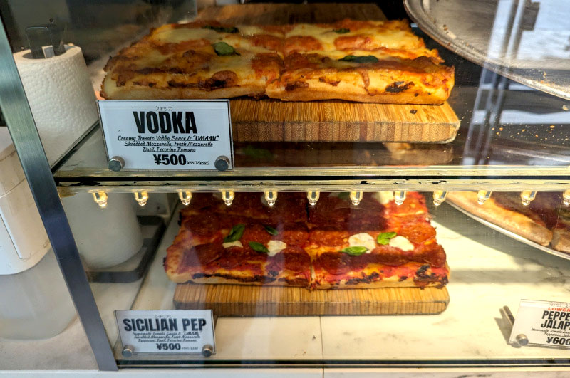 Pizzas start at around Y550 per slice, and two slices are probably big enough for a meal.