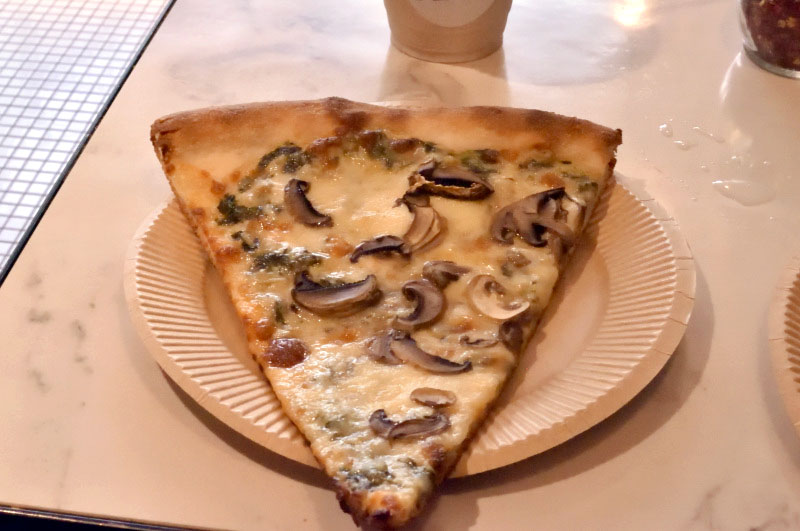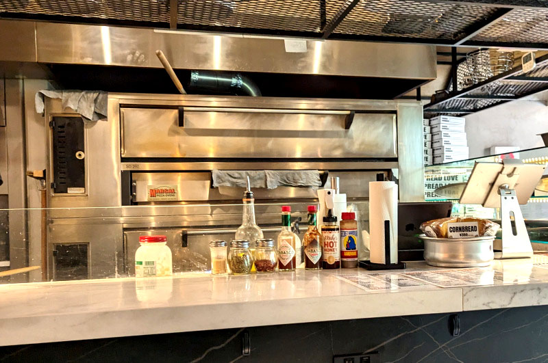 Tables are furnished with proper New York pizza condiments - shakers of red-pepper flakes and oregano, powdered garlic, and bottles of Secret Aardvark pepper sauce. In addition to pizza they also serve chicken - buttermilk fried chicken, chicken and waffles, and Buffalo wings. Drinks options include chocolate egg creams, milkshakes, espresso drinks, cocktails and several different tequilas.