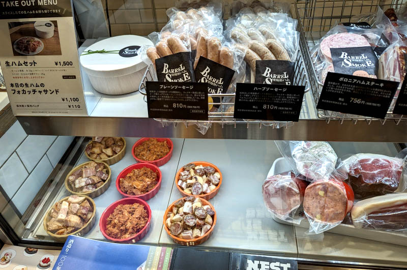 The popular Ibaraki-based brewery also runs a ham factory, producing premium cured meats under the "Barrel Smoke" brand, and you can buy sausages and hams to take home. The name comes from the production method - to impart extra flavor during the smoking process they use oak barrels in which Hinomaru whiskey has been aged.