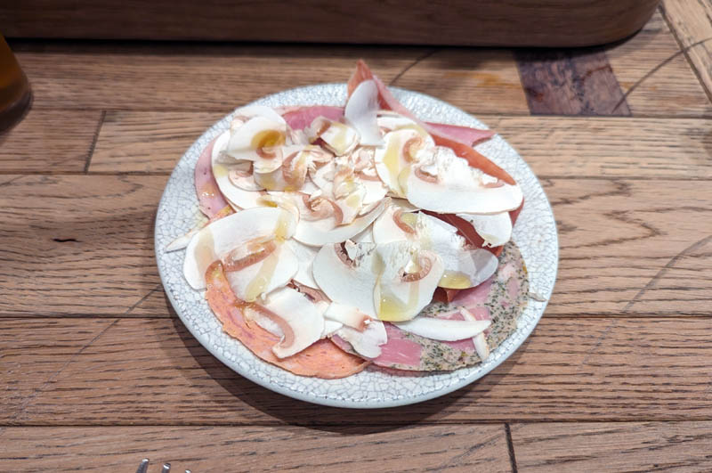 The bar's food menu showcases Barrel Smoke meats, and at lunchtime you can get focaccia sandwiches stuffed with the "prosciutto of the day". The excellent charcuterie platter comes in two sizes and features six or seven different meats, plus thinly sliced raw mushrooms as an option. Side dishes include baked pulled pork with cheese, German potatoes with crispy bacon, and aged bacon and mushroom ajillo.