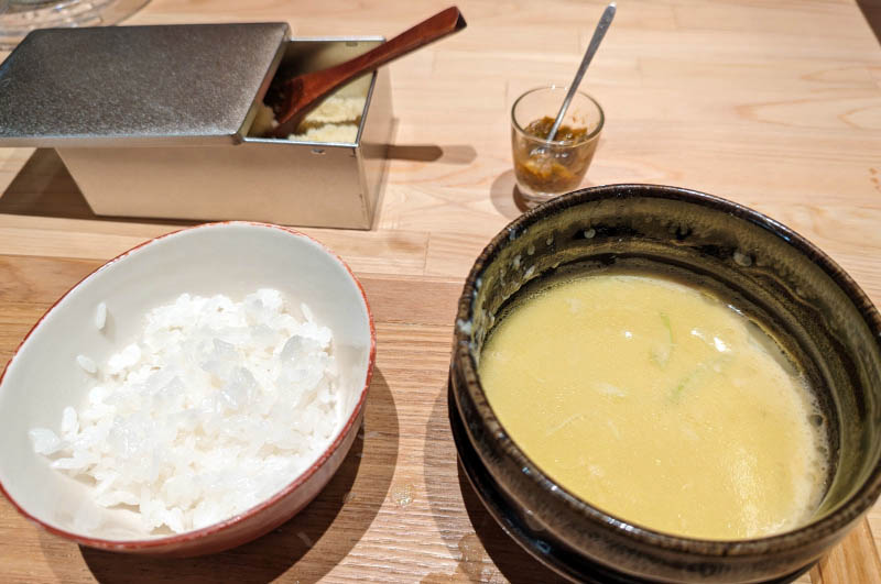 We were advised to leave a portion of the dipping sauce for the next course. This was a do-it-yourself risotto made by adding rice to the remaining dipping sauce and stirring in lots of additional cheese and a spicy yuzu condiment. It might be hard going back to ordinary ramen after this magnificent bowl.