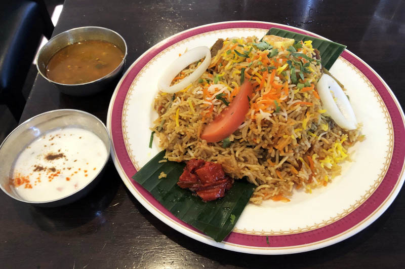 The classic Dumbuk Zafrani Biryani is cooked Hyderabad-style and comes in three varieties: chicken, lamb and vegetable. The huge mound of saffron rice covers large portions of tender meat on the bone, garnished with chutney, coriander and onions. Add some raita and the sour masala soup if you like it wet.