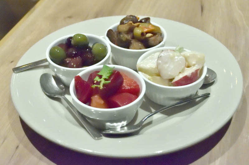 The multi-part "deli platter" makes an invigorating start to a meal. It's an assortment of four cold vegetable-centered delicacies like eggplant caponata, marinated beets, cole slaw with pecorino romano cheese and nuts, and marinated chickpeas and dried tomatoes - all with fresh Mediterranean flavors designed to perk up the appetite.