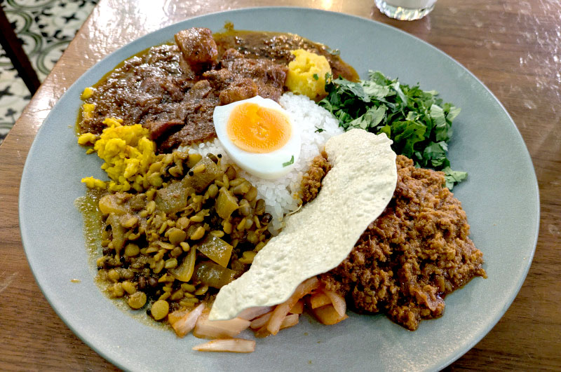 Curry combos come with a scoop of mild dal, pickled onions, pickled radish, a bit of cilantro, a soft-boiled egg, a very crisp wafer of papad, rice, plus optional toppings, producing a very appetizing mix of contrasting flavors on your plate.