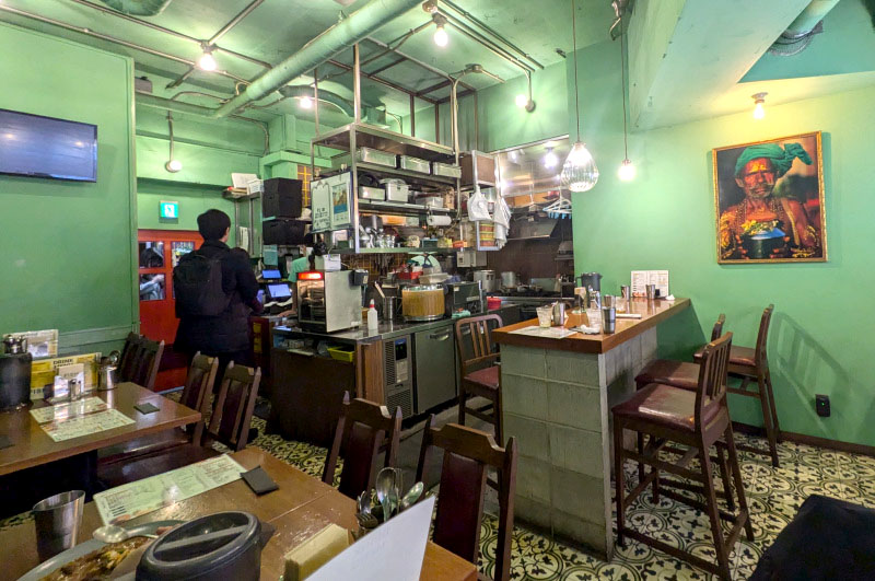 The dining room seats around two dozen - relatively large by the standards of Tokyo curry shops - with a handful of chairs in front of the shop to accommodate waiting customers. The restaurant's full name is "Fish Curry Shop Made by Three Uncles." It was a popular lunchtime destination in Ark Hills for some thirty years before closing; the current Shinjuku incarnation opened in 2018 and is run by a former customer.