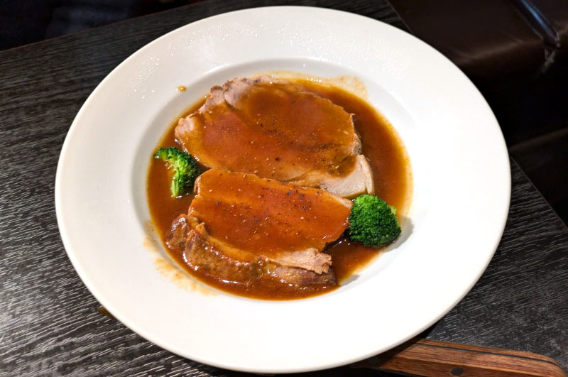 Among the wine-friendly snacks here, the zwiebelkuchen - a tart made with caramelized onions, bacon, cheese, eggs and cream - is highly recommended. The home-made herb sausages were also a pleasant surprise, a cut or two above the usual German sausages we've encountered in Tokyo. The tasty beer-simmered pork is a hefty portion of shoulder and belly meat, stewed with beer and assorted vegetables until very tender. We made sure to soak up every bit of the dish's gravy with the bread provided.