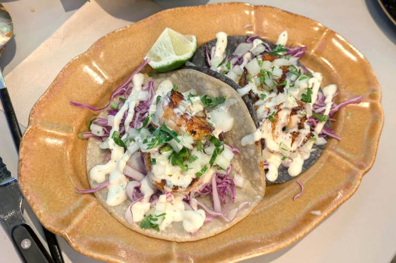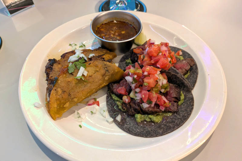 At the heart of the food menu is a tempting selection of tacos, stuffed with birria, steak, shrimp, pork (carnitas) or chicken tikka. All the varieties we've tried have been quite satisfying, but the birria tacos are especially recommended. The stewed beef filling comes in a crunchy fried taco shell that's served with a richly flavored, meaty consomme for dipping.
