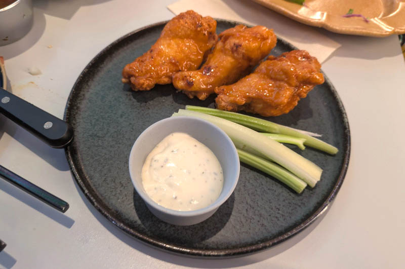 Another beer-friendly side dish is chicken wings in various styles. We enjoyed the Buffalo version, the meaty wings coated in slightly spicy BBQ sauce and served with a mild (not so blue-cheesy) dipping sauce and very fresh skinny celery sticks.