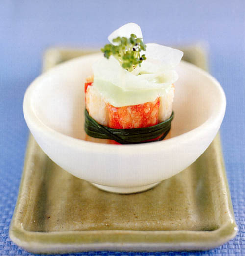 Mix wasabi and mayonnaise to a smooth consistency. Cut each crab stick in half. Tie 2 crab sticks together with 4 pieces chives. Place a tied crab stick to stand on cut end on each bowl, and top with wasabi mayonnaise, daikon strip and mustard cress.