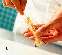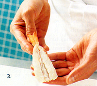 1. Wash shrimp under running water and cut off heads. Insert a bamboo skewer or long toothpick along shrimp from head to tail, running along legs of shrimp without touching flesh. Drop shrimp into a pot of salted, boiling water (use enough salt to make it taste like seawater). Boiling shrimp in salted water keeps protein in shrimp. They will sink to bottom and after 3 to 5 minutes will change color and rise to top. (Do not use a lid, or a strong smell of shrimp will remain.) To check that they are cooked, remove one shrimp from water and squeeze gently. If inside is firm, it is cooked. Quickly place shrimp in ice water. This gives them a good color and stops flesh from shrinking and becoming hard. When shrimp are cold, remove from ice water and place in a colander. To remove skewer, use a screwing motion to avoid breaking flesh. Remove shell from around body, but not tail. |